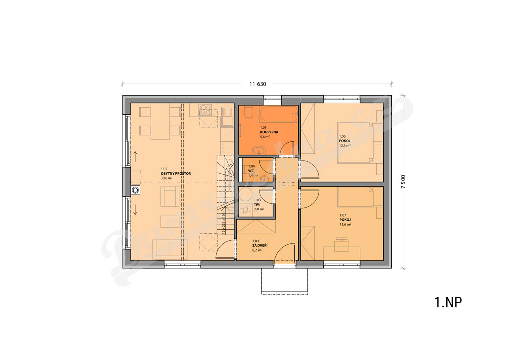 Přízemí – Zádveří, obytný prostor s kuchyní a vstupem na terasu, 2 pokoje, koupelna, WC, technická místnost